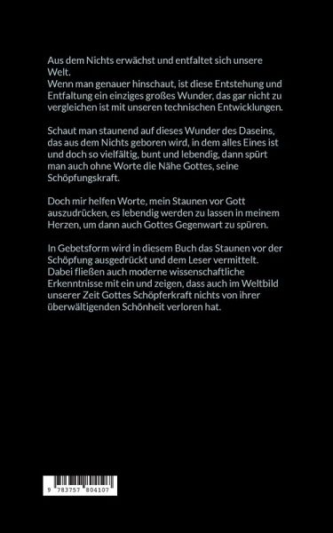 Aus dem Nichts erwächst und entfaltet sich unsere Welt. Wenn man genauer hinschaut, ist diese Entstehung und Entfaltung ein einziges großes Wunder, das gar nicht zu vergleichen ist mit unseren technischen Entwicklungen.Schaut man staunend auf dieses Wunder des Daseins, das aus dem Nichts geboren wird, in dem alles Eines ist und doch so vielfältig, bunt und lebendig, dann spürt man auch ohne Worte die Nähe Gottes, seine Schöpfungskraft.Doch mir helfen Worte, mein Staunen vor Gott auszudrücken, es lebendig werden zu lassen in meinem Herzen, um dann auch Gottes Gegenwart zu spüren. In Gebetsform wird in diesem Buch das Staunen vor der Schöpfung ausgedrückt und dem Leser vermittelt. Dabei fließen auch moderne wissenschaftliche Erkenntnisse mit ein und zeigen, dass auch im Weltbild unserer Zeit Gottes Schöpferkraft nichts von ihrer überwältigenden Schönheit verloren hat.