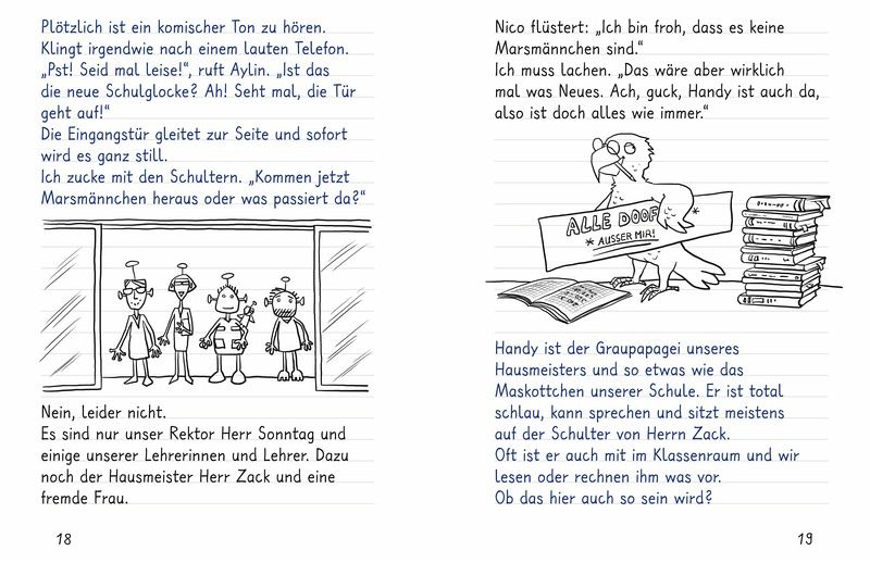 Die lesefreundliche Schrift erinnert an die Schreibschrift in der Schule.Zwischen den Textbausteinen gibt es schwarz-weiße, comicartige Zeichnungen, die den Humor der Geschichte ergänzen, aber auch als Lesepausen dienen.Die Seiten sind zweifarbig in Leseabschnitte unterteilt, ohne den Lesefluss zu verlieren.Zarte Linien im Hintergrund geben den Büchern einen Notizbuch-/Tagebuch-Charakter, helfen aber gleichzeitig, beim Lesen nicht zu verrutschen.Entweder liest der/die Leser_in für sich selbst, oder im Wechsel mit anderen.Durch die klare Struktur für alle Kinder in den unterschiedlichen Lesetrainingsstufen geeignet.