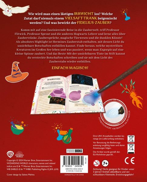 Wie wird man einen lästigen IRRWICHT los? Welche Zutat darf niemals einem VIELSAFT-TRANK beigemischt werden? Und was bewirkt der FIDELIUS-ZAUBER?Komm mit auf eine faszinierende Reise in die Zauberwelt, triff Professor Flitwick, Professor Sprout und die anderen Hogwarts-Lehrer und lerne alles über Zaubertränke, Zaubersprüche, magische Tierwesen und die dunklen Künste!Als absolutes Highlight ist Hermines Zauberstab enthalten, mit dessen Licht du unsichtbare Botschaften enthüllen kannst. Finde heraus, welche mysteriösen Kreaturen im Großen See leben und was passiert, wenn man Engorgio auf eine kleine Spinne zaubert. Und das Beste: Mit der unsichtbaren Tinte im Stift kannst du auch selbst versteckte Botschaften schreiben und sie mit dem Licht des Zauberstabs wieder enthüllen. EINFACH MAGISCH!Drei LR41-Knopfzellen werden benötigt (im Lieferumfang enthalten).