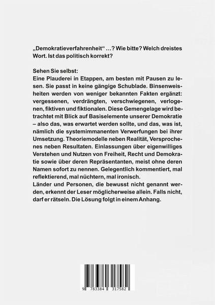 "Demokratieverfahrenheit" ...? Wie bitte? Welch dreistes Wort. Ist das politisch korrekt? Sehen Sie selbst: Eine Plauderei in Etappen, am besten mit Pausen zu lesen. Sie passt in keine gängige Schublade. Binsenweisheiten werden von weniger bekannten Fakten ergänzt: vergessenen, verdrängten, verschwiegenen, verlogenen, fiktiven und fiktionalen. Diese Gemengelage wird betrachtet mit Blick auf Basiselemente unserer Demokratie - also das, was erwartet werden sollte, und das, was ist, nämlich die systemimmanenten Verwerfungen bei ihrer Umsetzung. Theoriemodelle neben Realität, Versprochenes neben Resultaten. Einlassungen über eigen-williges Verstehen und Nutzen von Freiheit, Recht und Demokratie sowie über deren Reprä-sentanten, meist ohne deren Namen sofort zu nennen. Gelegentlich kommentiert, mal reflek-tierend, mal nüchtern, mal ironisch. Länder und Personen, die bewusst nicht genannt werden, erkennt der Leser möglicherweise allein. Falls nicht, darf er rätseln. Die Lösung folgt ineinem Anhang.