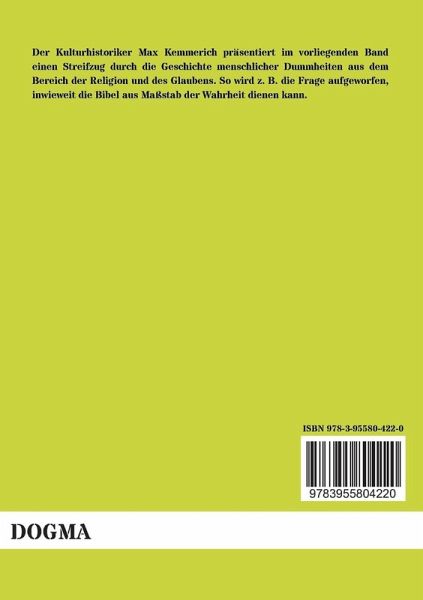 Der Kulturhistoriker Max Kemmerich präsentiert im vorliegenden Band einen Streifzug durch die Geschichte menschlicher Dummheiten aus dem Bereich der Religion und des Glaubens. So wird z. B. die Frage aufgeworfen, inwieweit die Bibel aus Maßstab der Wahrheit dienen kann.