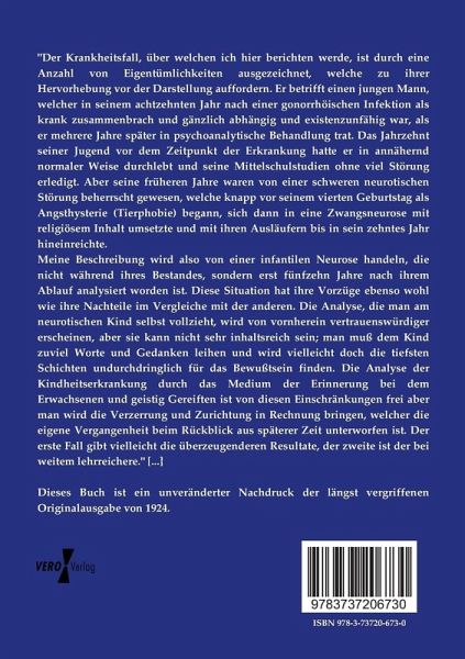 "Der Krankheitsfall, über welchen ich hier berichten werde, ist durch eine Anzahl von Eigentümlichkeiten ausgezeichnet, welche zu ihrer Hervorhebung vor der Darstellung auffordern. Er betrifft einen jungen Mann, welcher in seinem achtzehnten Jahr nach einer gonorrhöischen Infektion als krank zusammenbrach und gänzlich abhängig und existenzunfähig war, als er mehrere Jahre später in psychoanalytische Behandlung trat. Das Jahrzehnt seiner Jugend vor dem Zeitpunkt der Erkrankung hatte er in annähernd normaler Weise durchlebt und seine Mittelschulstudien ohne viel Störung erledigt. Aber seine früheren Jahre waren von einer schweren neurotischen Störung beherrscht gewesen, welche knapp vor seinem vierten Geburtstag als Angsthysterie (Tierphobie) begann, sich dann in eine Zwangsneurose mit religiösem Inhalt umsetzte und mit ihren Ausläufern bis in sein zehntes Jahr hineinreichte.