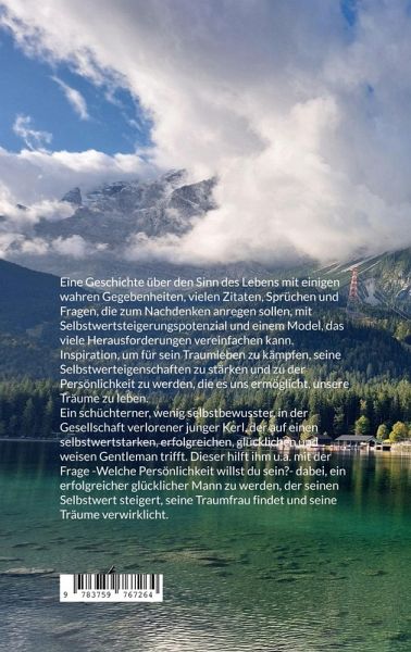 Eine Geschichte über den Sinn des Lebens mit einigen wahren Gegebenheiten, vielen Zitaten, Sprüchen und Fragen, die zum Nachdenken anregen sollen, mit Selbstwertsteigerungspotenzial und einem Model, das viele Herausforderungen vereinfachen kann. Inspiration, um für sein Traumleben zu kämpfen, seine Selbstwerteigenschaften zu stärken und zu der Persönlichkeit zu werden, die es uns ermöglicht, unsere Träume zu leben. Ein schüchterner, wenig selbstbewusster, in der Gesellschaft verlorener junger Kerl, der auf einen selbstwertstarken, erfolgreichen, glücklichen und weisen Gentleman trifft. Dieser hilft ihm u.a. mit der Frage -Welche Persönlichkeit willst du sein?- dabei, ein erfolgreicher glücklicher Mann zu werden, der seinen Selbstwert steigert, seine Traumfrau findet und seine Träume verwirklicht.