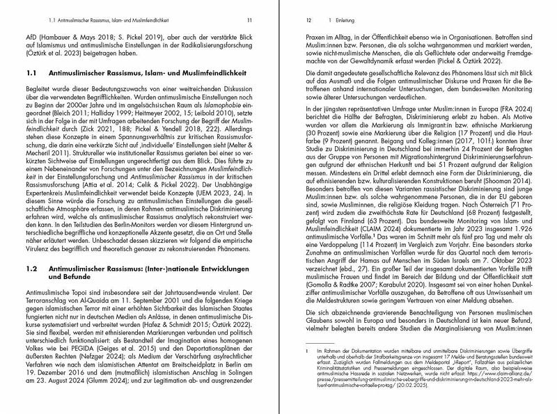 In den letzten Jahrzehnten reißen die Debatten über den Islam und Musliminnen und Muslime in Deutschland kaum ab und werden auch in Berlin mit Schärfe geführt. Wie bereits vorherige bundesweite Umfragen hat auch der »Berlin-Monitor 2023« eine weitreichende Verbreitung antimuslimischer Einstellungen in der Berliner Bevölkerung aufgezeigt. Sahen die einen »den Islam« als rückständig und nicht veränderungsfähig an, wünschten sich andere einen Zuwanderungsstopp speziell für Musliminnen und Muslime. Was bedeutet all dies für muslimische Berlinerinnen und Berliner? Erleben sie Diskriminierung, und wenn ja, wie oft und wie intensiv? Was sind die Folgen? Welche Umgangsweisen werden gefunden? Und welche Forderungen und Perspektiven gibt es?Das vorliegende Buch vereint unterschiedliche Forschungszugänge mit dem Ziel, antimuslimischen Rassismus in Berlin insbesondere aus der Perspektive von Betroffenen zu beschreiben. Auf der Basis zweier quantitativer Studien, von Interviews mit Fachleutenund von Gruppendiskussionen werden Antworten auf die aufgeworfenen Fragen gegeben. Die Studie fand im Rahmen des »Berlin-Monitors« statt.