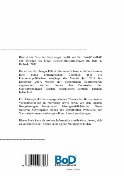 Band 6 von "Aus der Starnberger Politik von Dr. Thosch" enthält alle Beiträge des Blogs www.politik-starnberg.de aus dem 2. Halbjahr 2017. Der an der Starnberger Politik interessierte Leser erhält mit diesem Buch einen umfangreichen Überblick über die kommunalpolitischen Vorgänge der Monate Juli 2017 bis Dezember 2017, welche mit persönlichen Kommentaren angereichert wurden. Neben den Protokollen der Stadtratssitzungen werden verschiedene aktuelle Themen beleuchtet.Ein Schwerpunkt der angesprochenen Themen ist die spannende Verkehrssituation in Starnberg sowie deren von den lokalen Gruppierungen bevorzugten Lösungsmöglichkeiten. Einen weiteren Schwerpunkt bilden die detaillierten Protokolle der Stadtratssitzungen und ausgewählter Ausschusssitzungen.Dieses Buch kann als weitere Informationsquelle dazu dienen, sich zu verschiedenen Themen seine eigene Meinung zu bilden.