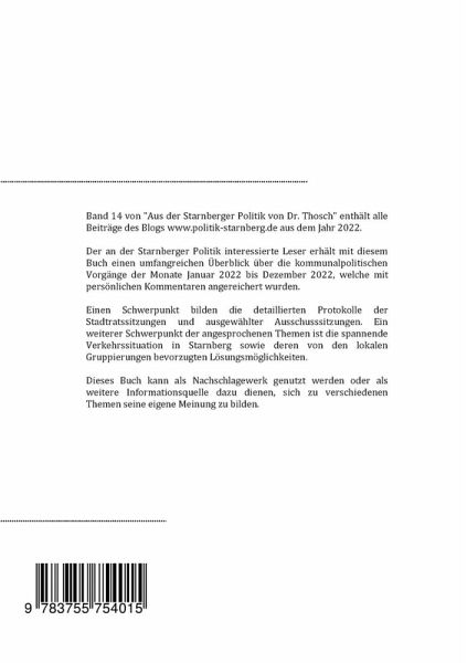 Band 14 von "Aus der Starnberger Politik von Dr. Thosch" enthält alle Beiträge des Blogs www.politik-starnberg.de aus dem Jahr 2022. Der an der Starnberger Politik interessierte Leser erhält mit diesem Buch einen umfangreichen Überblick über die kommunalpolitischen Vorgänge der Monate Januar 2022 bis Dezember 2022, welche mit persönlichen Kommentaren angereichert wurden. Neben den Protokollen der Stadtratssitzungen werden verschiedene aktuelle Themen beleuchtet.Dieses Buch kann als weitere Informationsquelle dazu dienen, sich zu verschiedenen Themen seine eigene Meinung zu bilden.