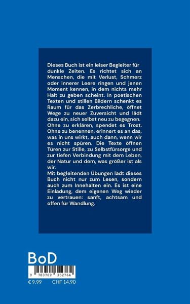 Dieses Buch ist ein leiser Begleiter für dunkle Zeiten. Es richtet sich an Menschen, die mit Verlust, Schmerz oder innerer Leere ringen und jenen Moment kennen, in dem nichts mehr Halt zu geben scheint. In poetischen Texten und stillen Bildern schenkt es Raum für das Zerbrechliche, öffnet Wege zu neuer Zuversicht und lädt dazu ein, sich selbst neu zu begegnen. Ohne zu erklären, spendet es Trost. Ohne zu benennen, erinnert es an das, was in uns wirkt, auch dann, wenn wir es nicht spüren. Die Texte öffnen Türen zur Stille, zu Selbstfürsorge und zur tiefen Verbindung mit dem Leben, der Natur und dem, was größer ist als wir. Mit begleitenden Übungen lädt dieses Buch nicht nur zum Lesen, sondern auch zum Innehalten ein. Es ist eine Einladung, dem eigenen Weg wieder zu vertrauen: sanft, achtsam und offen für Wandlung.