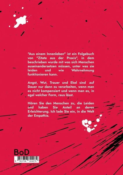 "Aus einem Innenleben" ist ein Folgebuch von "Zitate aus der Praxis", in dem beschrieben wurde mit was sich Menschen auseinandersetzen müssen, unter was sie leiden und wie Wahrnehmung funktionieren kann.Angst, Wut, Trauer und Ekel sind auf Dauer nur dann zu verarbeiten, wenn man es nicht kompensiert und wenn man es, in egal welcher Form, raus lässt.Hören Sie den Menschen zu, die Leiden und haben Sie Anteil an deren Erleichterung. Ich lade Sie ein, in die Welt der Empathie.