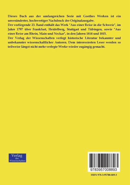 Dieses Buch aus der umfangreichen Serie mit Goethes Werken ist ein unveränderter, hochwertiger Nachdruck der Originalausgabe. Der vorliegende 23. Band enthält das Werk "Aus einer Reise in die Schweiz", im Jahre 1797 über Frankfurt, Heidelberg, Stuttgart und Tübingen, sowie "Aus einer Reise am Rhein, Main und Neckar", in den Jahren 1814 und 1815. Der Verlag der Wissenschaften verlegt historische Literatur bekannter und unbekannter wissenschaftlicher Autoren. Dem interessierten Leser werden so teilweise längst nicht mehr verlegte Werke wieder zugängig gemacht.