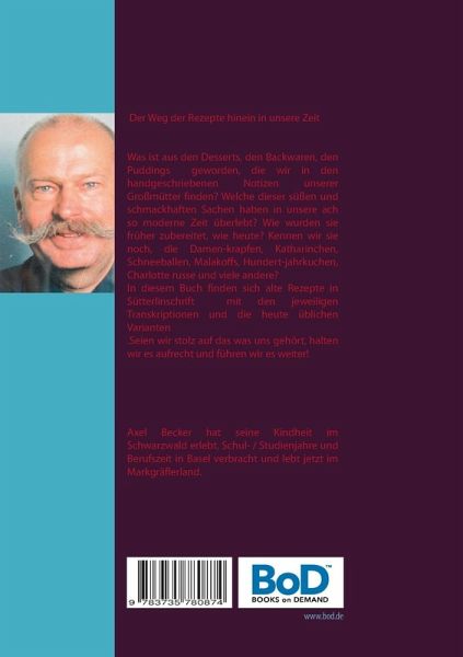 Der Weg der Rezepte hinein in unsere ZeitWas ist aus den Desserts, den Backwaren, den Puddings geworden, die wir in den handgeschriebenen Notizen unserer Großmütter finden? Welche dieser süßen und schmackhaften Sachen haben in unsere ach so moderne Zeit überlebt? Wie wurden sie früher zubereitet, wie heute? Kennen wir sie noch, die Damenkrapfen, Katharinchen, Schneeballen, Malakoffs, Hundertjahrkuchen, Charlotte russe und viele andere? In diesem Buch finden sich alte Rezepte in Sütterlinschrift mit den jeweiligen Transkriptionen und die heute üblichen Varianten.Seien wir stolz auf das was uns gehört, halten wir es aufrecht und führen wir es weiter! Axel Becker hat seine Kindheit im Schwarzwald erlebt, Schul- / Studienjahre und Berufszeit in Basel verbracht und lebt jetzt im Markgräflerland.