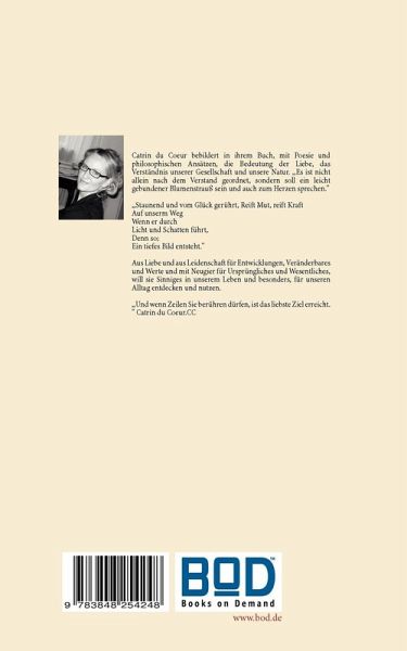 Catrin du Coeur bebildert in ihrem Buch, mit Poesie und philosophischen Ansätzen, die Bedeutung der Liebe, das Verständnis unserer Gesellschaft und unsere Natur. ,,Es ist nicht allein nach dem Verstand geordnet, sondern soll ein leicht gebundener Blumenstrauß sein und auch zum Herzen sprechen.Und wenn Zeilen Sie berühren dürfen,ist das liebste Ziel erreicht.''So ist das Büchlein gut beschrieben, das einfach in seiner Ausführung, ein ebensolches Gemüt ansprechen soll, für ein wenig mehr Mut und Zuversicht.Entdecken Sie den Charme kleiner Schwächen und entwickeln Sie die Gedanken zu Liebe, Gesellschaft und Natur weiter.,,Staunend und vom Glück gerührt, Reift Mut, reift Kraft Auf unserm Weg, Wenn er durch Licht und Schatten führt, Denn so; Ein tiefes Bild entsteht.''