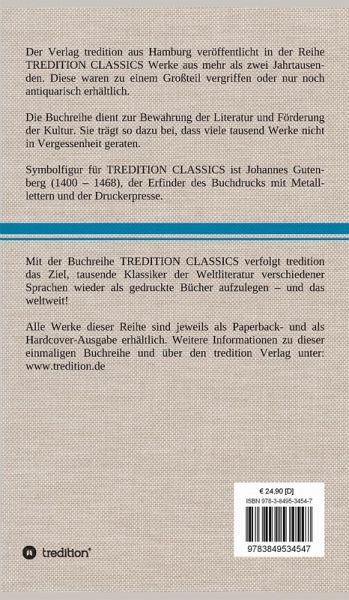 Diese Hardcover-Ausgabe ist Teil der TREDITION CLASSICS. Der Verlag tredition aus Hamburg veröffentlicht in der Buchreihe TREDITION CLASSICS Werke aus mehr als zwei Jahrtausenden. Diese waren zu einem Großteil vergriffen oder nur noch antiquarisch erhältlich. Mit TREDITION CLASSICS verfolgt tredition das Ziel, tausende Klassiker der Weltliteratur verschiedener Sprachen wieder als gedruckte Bücher zu verlegen und das weltweit! Die Buchreihe dient zur Bewahrung der Literatur und Förderung der Kultur. Sie trägt so dazu bei, dass viele tausend Werke nicht in Vergessenheit geraten.