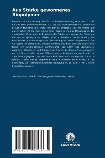 Polymere sind für einen großen Teil der Umweltzerstörung verantwortlich, da sie aus Erdöl gewonnen werden, d.h. sie sind nicht erneuerbare Quellen und brauchen Hunderte von Jahren, um sich zu zersetzen. Das allgemeine Ziel dieser Arbeit ist die Herstellung eines Biopolymers aus Maniokstärke. Die spezifischen Ziele sind die Extraktion der Stärke aus Maniok, die Förderung der sauren Hydrolyse der Stärke mit 0,1M Salzsäure, die Entwicklung des Biopolymers und die Analyse der Zersetzungszeit dieses Biopolymers. Um die Stärke zu extrahieren, wurden während des Extraktionsprozesses eine Reihe von Arbeitsschritten durchgeführt, vor allem das Zerkleinern, Abseihen, Dekantieren und Trocknen der Stärke, die dann in 5 g eingewogen und mit Wasser erhitzt wurde, Während dieses Erhitzens wurden 6 ml 0,1 M Salzsäure zugegeben, um die saure Hydrolyse (Aufspaltung) der Stärke zu fördern. Damit dieses Biopolymer eine formbarere Form erhält, ist es notwendig, ein Plastifizierungsmittel hinzuzufügen, zu dem 4 ml Glycerin hinzugefügt wurden.