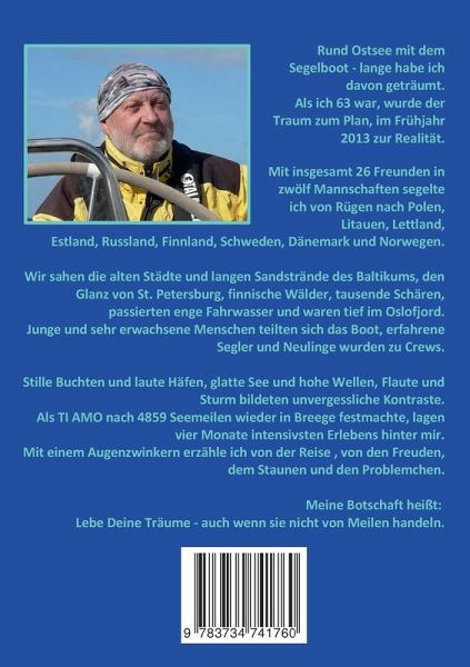 Rund Ostsee mit dem Segelboot - lange hat der Autor davon geträumt.Als er 63 Jahre alt war, wurde der Traum zum Plan, im Frühjahr 2013 zur Realität.Mit insgesamt 26 Freunden in zwölf Mannschaften segelte er mit der Charteryacht TI AMO vom Typ BAVARIA 36 ab Rügen nach Polen, Litauen, Lettland, Estland, Russland, Finnland, Schweden, Dänemark und Norwegen.Die Seeleute sahen die alten Städte und die langen Sandstrände des Baltikums, den Glanz von St. Petersburg, Helsinki und Oslo, finnische Wälder, tausende Schären, passierten enge Fahrwasser, versanken im Nebel, waren wilden Winden ausgesetzt und tauchten tief den Oslofjord ein.Sehr junge und sehr erwachsene Menschen teilten sich das Boot, erfahrene Segler und Neulinge wurden zu Crews.Stille Buchten und laute Häfen, glatte See und hohe Wellen, Flaute und Sturm bildeten unvergessliche Kontraste.Als TI AMO nach 4859 Seemeilen wieder in Breege festmachte, lagen vier Monate intensivsten Erlebens hinter Yacht und Skipper.Mit einem Augenzwinkern erzählt der Autor von der Reise, von den Freuden, dem Staunen und den Problemchen.Seine Botschaften heißen: Lebe Deine Träume - auch wenn sie nicht von Meilen handeln.Deine Träume werden leben, Du musst es nur wollen.Das Besondere am Buch und an der Reise:Viele Segler haben die Ostsee auf unterschiedlichen Routen durchfahren. Dazu gibt es einiges an Literatur.Dieses Buch und diese Reise heben sich davon ab, - weil zu diesem Thema erstmals ein Autor aus einem neuen Bundesland schreibt;- weil der Rundum-Törn mit einer Charteryacht absolviert wurde;- weil noch nicht von einer großen Ostseerunde mit zwölf Mannschaften und 27 Teilnehmern berichtet wurde;- weil die Reise mit 4859 Seemeilen entlang der gesamten Ostseeküste in alle Anliegerländer bis hin nach Oslo geführt hat.Häfen und Ankerplätze werden beschrieben, eine Übersicht mit Seitenverweisen erleichtert das Auffinden, im umfänglichen Glossar werden Fachbegriffe erläutert.