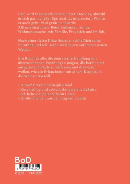 Paul wird versehentlich erleuchtet. Und das, obwohl er sich gar nicht für Spiritualität interessiert. Wohin er auch geht, Paul gerät in absurde Alltagssituationen: Beim Einkaufen, auf der Wohnungssuche, mit Familie, Freunden und im Job. Nach einer tiefen Krise findet er schließlich seine Berufung und teilt seine Weisheiten auf immer neuen Wegen.Ein Buch für alle, die eine straffe Handlung mit überraschenden Wendungen mögen, die bereit sind ausgetretene Pfade zu verlassen und die wissen wollen, wie ein Erleuchteter mit einem Klappstuhl die Welt retten will.Leserstimmen:"Unterhaltsam und inspirierend""Kurzweilige und abwechslungsreiche Lektüre""Ich habe viel gelacht beim Lesen""Große Themen mit Leichtigkeit erzählt"