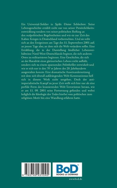 Ein Universial-Soldier in Späh: Dieter Schlechter. Seine Lebensgeschichte erzählt nicht nur von seiner Persönlichkeitsentwicklung, sondern von seiner politischen Reifung an den realpolitischen Begebenheiten und wie sie zur Zeit des Kalten Krieges in Deutschland vorherrschten. Und sie reibt sich an den Ereignissen am Tage des 11. Septembers 2001 auf; an jenem Tage also, an dem sich die Welt verändern sollte. Eine Erzählung, die in der Darstellung ländlicher Lebensverhältnisse Nord-West-Deutschlands beginnt, die sich anderen Ortes zu militarisieren beginnen. Eine Geschichte, die sich an der Banalität eines gärtnerischen Lebens nicht aufhält, sondern sich zu einem spannenden Politthriller entwickelt und wie er sich nur in den 70´er Jahren des 20. Jahrhunderts ausgestalten konnte. Eine dramatische Auseinandersetzung mit dem sich überall aufdrängenden Welt-Kommunismus ließ sich in diesem Werk nicht umgehen. Doch der anti-imperialistische Kampf zu jener Zeit stellt sich hier nur als eine perfide Form des grassierenden Welt-Terrorismus heraus, wie er am 11. 09. 2001 seine Fortsetzung gefunden und wobei lediglich die Ideologie des Todes hierbei vom politischen zum religiösen Motiv hin eine Wandlung erfahren hatte.