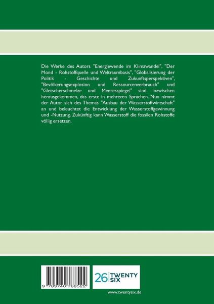 Die Werke des Autors "Energiewende im Klimawandel", "Der Mond - Rohstoffquelle und Weltraumbasis", "Globalisierung der Politik - Geschichte und Zukunftsperspektiven", "Bevölkerungsexplosion und Ressourcenverbrauch" und "Gletscherschmelze und Meeresspiegel" sind inzwischen herausgekommen, das erste in mehreren Sprachen. Nun nimmt der Autor sich des Themas "Ausbau der Wasserstoffwirtschaft" an und beleuchtet die Entwicklung der Wasserstoffgewinnung und -Nutzung. Zukünftig kann Wasserstoff die fossilen Rohstoffe völlig ersetzen.