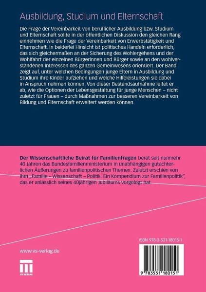 Die Frage der Vereinbarkeit von beruflicher Ausbildung bzw. Studium und Elternschaft sollte in der öffentlichen Diskussion den gleichen Rang einnehmen wie die Frage der Vereinbarkeit von Erwerbstätigkeit und Elternschaft. In beiderlei Hinsicht ist politisches Handeln erforderlich, das sich gleichermaßen an der Sicherung des Wohlergehens und der Wohlfahrt der einzelnen Bürgerinnen und Bürger sowie an den wohlverstandenen Interessen des ganzen Gemeinwesens orientiert. Der Band zeigt auf, unter welchen Bedingungen junge Eltern in Ausbildung und Studium ihre Kinder aufziehen und welche Hilfeleistungen sie dabei in Anspruch nehmen können. Von dieser Bestandsaufnahme leitet er ab, wie die Optionen der Lebensgestaltung für junge Menschen - nicht zuletzt für Frauen - durch Maßnahmen zur besseren Vereinbarkeit von Bildung und Elternschaft erweitert werden können.