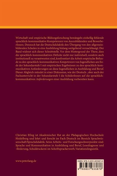 Inhalt: Christian Efing: Ausbildungsvorbereitender Deutschunterricht an allgemeinbildenden Schulen? - Legitimation und Definition - Volker Rexing/Christina Keimes/Birgit Ziegler: Lesekompetenz von BerufsschülerInnen - Befunde und Konsequenzen - Joachim Schäfer: Schreibkompetenz von Haupt- und Realschulabsolventen - Elke Grundler: Gesprächskompetenz von Haupt- und Realschulabsolventen - Werner Bader: Anforderungen an sprachlich-kommunikative Kompetenzen von Auszubildenden. Ein Blick aus der Praxis - Christian Efing: Sprachlich-kommunikative Anforderungen in der betrieblichen Ausbildung - Peter Wengel: Sprachlich-kommunikative Anforderungen in der Berufsschule - Kirsten Schindler: Schreiben im Beruf - Matilde Grünhage-Monetti: Warum Deutsch nicht dort fördern, wo es gebraucht wird? Am Arbeitsplatz - Christina Kuhn: Fremdsprachenbedarf in Ausbildung und Beruf - Christian Efing: (Wie) Bereitet der bisherige Deutschunterricht auf die Ausbildung vor? Eine Schulbuchanalyse - Constanze Niederhaus: Zur ausbildungsvorbereitenden Förderung der Lesekompetenz in der Sekundarstufe I - Ulrike Pospiech: Das Schreiben im Beruf erkunden. Drei Vorschläge für die ausbildungsvorbereitende Förderung der Schreibkompetenz an Haupt- und Realschulen - Carmen Spiegel: Die ausbildungsvorbereitende Förderung von Gesprächskompetenzen an Realschulen - Thorsten Roelcke: Fachsprachendidaktik in Haupt- und Realschulen - ein Weg der Ausbildungsvorbereitung? - Josef Leisen: Sprachsensibler Fachunterricht und Sprachförderung im Fachunterricht - ein Weg der Ausbildungsvorbereitung.