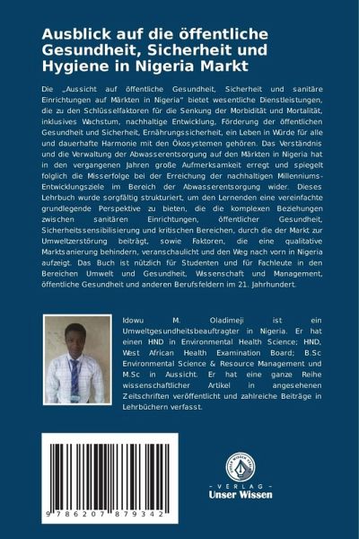 Die "Aussicht auf öffentliche Gesundheit, Sicherheit und sanitäre Einrichtungen auf Märkten in Nigeria" bietet wesentliche Dienstleistungen, die zu den Schlüsselfaktoren für die Senkung der Morbidität und Mortalität, inklusives Wachstum, nachhaltige Entwicklung, Förderung der öffentlichen Gesundheit und Sicherheit, Ernährungssicherheit, ein Leben in Würde für alle und dauerhafte Harmonie mit den Ökosystemen gehören. Das Verständnis und die Verwaltung der Abwasserentsorgung auf den Märkten in Nigeria hat in den vergangenen Jahren große Aufmerksamkeit erregt und spiegelt folglich die Misserfolge bei der Erreichung der nachhaltigen Millenniums-Entwicklungsziele im Bereich der Abwasserentsorgung wider. Dieses Lehrbuch wurde sorgfältig strukturiert, um den Lernenden eine vereinfachte grundlegende Perspektive zu bieten, die die komplexen Beziehungen zwischen sanitären Einrichtungen, öffentlicher Gesundheit, Sicherheitssensibilisierung und kritischen Bereichen, durch die der Markt zur Umweltzerstörung beiträgt, sowie Faktoren, die eine qualitative Marktsanierung behindern, veranschaulicht und den Weg nach vorn in Nigeria aufzeigt. Das Buch ist nützlich für Studenten und für Fachleute in den Bereichen Umwelt und Gesundheit, Wissenschaft und Management, öffentliche Gesundheit und anderen Berufsfeldern im 21. Jahrhundert.