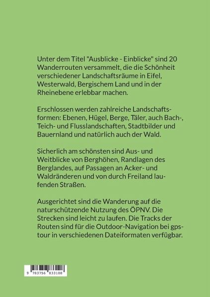 Unter dem Titel "Ausblicke - Einblicke" sind 20 Wanderrouten versammelt, diie die Schönheit verschiedener Landschaftsräume in Eifel, Westerwald, Bergischem Land und in der Rheinebene erlebbar machen.Erschlossen werden zahlreiche Landschaftsformen: Ebenen, Hügel, Berge, Täler, auch Bach-, Teich- und Flusslandschaften, Stadtbilder und Bauernland und natürlich auch der Wald.Sicherlich am schönsten sind Aus- und Weitblicke von Berghöhen, Randlagen des Berglandes, auf Passagen an Acker- und Waldränderen und von über Freiland laufenden Straßen.Ausgerichtet sind die Wanderung auf die naturschützende Nutzung des ÖPNV. Die Strecken sind leicht zu laufen. Die Tracks der Routen sind sind für die Outdoor-Navigation bei gps-tour in verschiedenen Dateiformaten verfügbar.