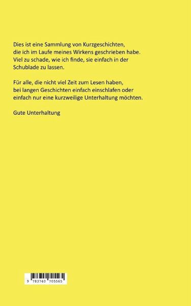 Dies ist eine Sammlung von Kurzgeschichten, die ich im Laufe der Jahre geschrieben habe. Viel zu schade, wie ich finde, sie einfach in der Schublade zu lassen.Für alle, die nicht viel Zeit zum Lesen haben, bei langen Geschichten einfach einschlafen oder einfach nur eine kurzweilige Unterhaltung möchten.Viel Spaß