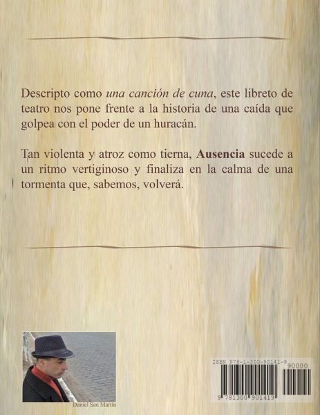 Descrito como "una canción de cuna", este libreto teatral nos pone frente a la historia de una caída que golpea con el poder de un huracán. Tan violenta y atroz como tierna, Ausencia sucede a un ritmo vertiginoso y finaliza en la calma de una tormenta que, sabemos, volverá.
