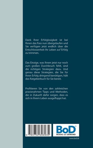 Haben auch Sie die Nase voll davon, dass ständig alles schief läuft in Ihrem Leben und Sie nie erfolgreich sind? Sind Sie es leid, immer und überall der Loser zu sein? Haben Sie es satt, dass alles was Sie anpacken floppt? Dann gratuliere ich Ihnen! Denn Sie können froh sein, dass es so weit gekommen ist und Sie so frustriert sind. Denn ohne Ihre Misserfolge und Niederlagen, wären Sie nicht an diesem wichtigen Punkt, der Ihnen jetzt den entscheidenden Kick verleiht, aus dem Jammertal der Erfolglosigkeit heraustreten zu wollen. Dank Ihrer Erfolglosigkeit ist bei Ihnen das Fass nun übergelaufen und Sie verfügen jetzt endlich über die Entschlossenheit Ihr Leben auf Erfolg zu trimmen. Das Einzige, was Ihnen jetzt nur noch zum großen Durchbruch fehlt, sind die richtigen Strategien dazu. Und genau diese Strategien, die Sie für Ihren Erfolg dringend benötigen, hält das Ratgeberbuch für Sie bereit. Profitieren Sie von den zahlreichen praxisnahmen Tipps und Methoden, die in Zukunft dafür sorgen, dass es sich in Ihrem Leben ausgefloppt hat.