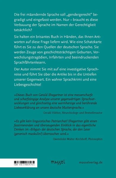 Die frei mäandernde Sprache soll "gendergerecht" begradigt und eingefasst werden. Nur - braucht es diese Verbauung der Sprache im Namen der Gerechtigkeit tatsächlich?Sie halten ein brisantes Buch in Händen, das Ihnen Antworten auf diese Frage liefern wird. Wie eine Schatzkarte führt es Sie zu den Quellen der deutschen Sprache. Sie werden Zeuge von geschichtsträchtigen Geburten, Verwechslungstragödien, Irrfahrten und beeindruckenden Sprachfährtenlesern.Der Autor nimmt Sie mit auf eine investigative Sprachreise und führt Sie über die Antike bis in die Untiefen unserer Gegenwart. Ein wahrer Sprachkrimi und eine Liebesgeschichte!