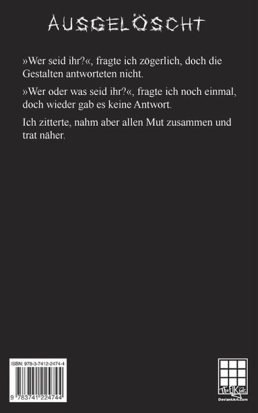 »Wer seid ihr?«, fragte ich zögerlich, doch die Gestalten antworteten nicht.»Wer oder was seid ihr?«, fragte ich noch einmal, doch wieder gab es keine Antwort.Ich zitterte, nahm aber allen Mut zusammen und trat näher.