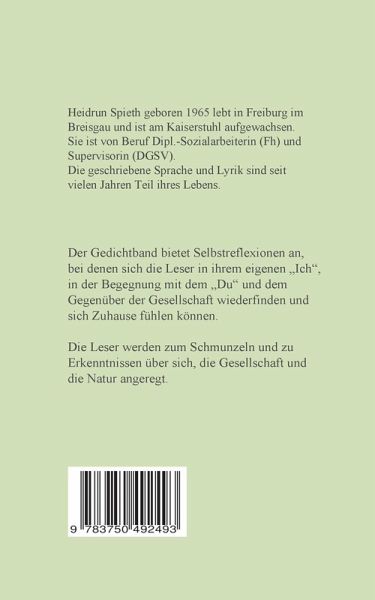 Der Gedichtband bietet Selbstreflexionen an, bei denen sich die Leser in ihrem eigenen "Ich", in der Begegnung mit dem "Du" und dem Gegenüber der Gesellschaft wiederfinden und sich Zuhause fühlen können.Die Leser werden zum Schmunzeln und zu Erkenntnissen über sich, die Gesellschaft und die Natur angeregt