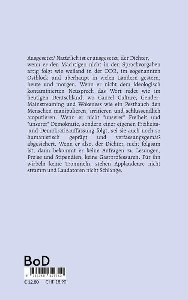 Ausgesetzt? Natürlich ist er ausgesetzt, der Dichter, wenn er den Mächtigen nicht in den Sprachvorgaben artig folgt wie weiland in der DDR, im sogenannten Ostblock und überhaupt in vielen Ländern gestern, heute und morgen. Wenn er nicht dem ideologisch kontaminierten Neusprech das Wort redet wie im heutigen Deutschland, wo Cancel Culture, Gender-Mainstreaming und Wokeness wie ein Pesthauch den Menschen manipulieren, irritieren und schlussendlich amputieren. Wenn er nicht "unserer" Freiheit und "unserer" Demokratie, sondern einer eigenen Freiheits- und Demokratieauffassung folgt, sei sie auch noch so humanistisch geprägt und verfassungsgemäß abgesichert. Wenn er also, der Dichter, nicht folgsam ist, dann bekommt er keine Anfragen zu Lesungen, Preise und Stipendien, keine Gastprofessuren. Für ihn wirbeln keine Trommeln, stehen Applaudeure nicht stramm und Laudatoren nicht Schlange.