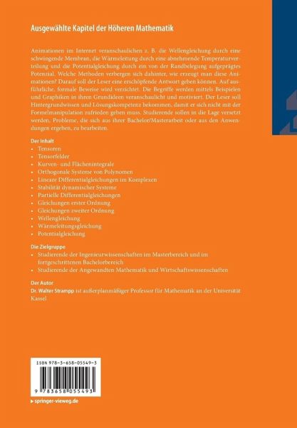 Animationen im Internet veranschaulichen z. B. die Wellengleichung durch eine schwingende Membran, die Wärmeleitung durch eine abnehmende Temperaturverteilung und die Potentialgleichung durch ein von der Randbelegung aufgeprägtes Potenzial. Welche Methoden verbergen sich dahinter, wie erzeugt man diese Animationen? Darauf soll der Leser eine erschöpfende Antwort geben können. Auf ausführliche, formale Beweise wird verzichtet. Die Begriffe werden mittels Beispielen und Graphiken in ihren Grundideen veranschaulicht und motiviert. Der Leser soll Hintergrundwissen und Lösungskompetenz bekommen, damit er sich nicht mit der Formelmanipulation zufrieden geben muss. Studierende sollen in die Lage versetzt werden, Probleme, die sich aus ihrer Bachelor/Masterarbeit oder aus den Anwendungen ergeben, zu bearbeiten.