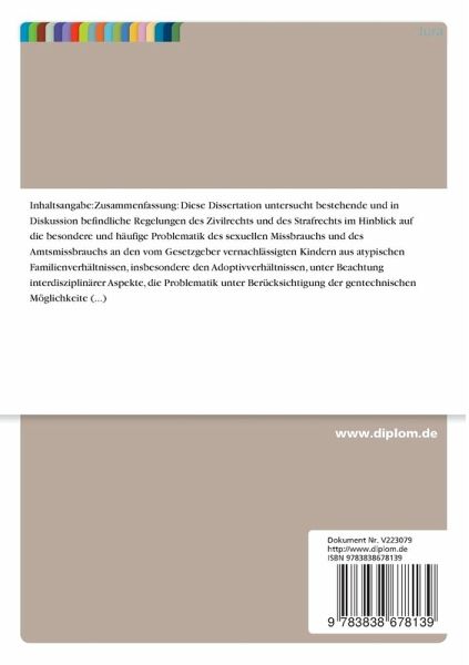 Diese Dissertation untersucht bestehende und in Diskussion befindliche Regelungen des Zivilrechts und des Strafrechts im Hinblick auf die besondere und häufige Problematik des sexuellen Missbrauchs und des Amtsmissbrauchs an den vom Gesetzgeber vernachlässigten Kindern aus atypischen Familienverhältnissen, insbesondere den Adoptivverhältnissen, unter Beachtung interdisziplinärer Aspekte, die Problematik unter Berücksichtigung der gentechnischen Möglichkeiten, unter Berücksichtigung internationaler Abkommen und Verträge sowie anhand bekannter Fälle und enthält Lösungsansätze als Anregung zur Diskussion.