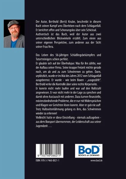 Das Leben des 56-jährigen Schädlingsbekämpfers und Tatortreinigers schien perfekt.Er glaubte sich auf der Überholspur. Was für ihn zählte, war der Aufbau seiner Firma. Seine knappe Freizeit reichte gerade noch, um ab und zu zum Schwimmen zu gehen. Dann, urplötzlich, wurde er im Mai des Jahres 2012 vom Schlaganfall ausgebremst. Er wurde - wie beim Boxen - "ausgezählt". Berthold verlor die Kontrolle über seine rechte Körperseite. Er konnte nicht mehr laufen und war auf den Rollstuhl angewiesen. Er war nicht mehr in der Lage zu sprechen und damit ohne Austausch mit anderen. Dazu kamen finanzielle, existenzbedrohende Probleme, die er nur mit Widersprüchen und Klagen vor Gerichten lösen konnte. Aber er gab nie auf! Trotz Halbseitenlähmung gelang es ihm, das Schwimmen wieder zu erlernen! Vielleicht hatte er diese Einstellung - niemals aufzugeben - aus dem Boxsport übernommen, der Leidenschaft aus seiner Jugendzeit ...