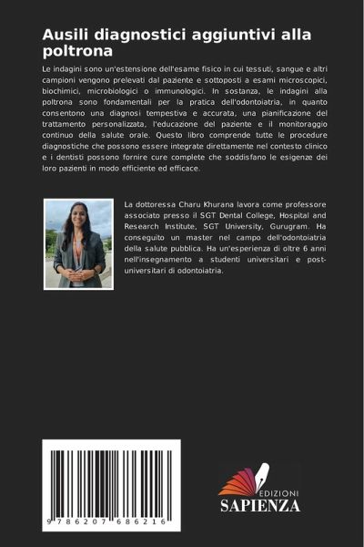 Le indagini sono un'estensione dell'esame fisico in cui tessuti, sangue e altri campioni vengono prelevati dal paziente e sottoposti a esami microscopici, biochimici, microbiologici o immunologici. In sostanza, le indagini alla poltrona sono fondamentali per la pratica dell'odontoiatria, in quanto consentono una diagnosi tempestiva e accurata, una pianificazione del trattamento personalizzata, l'educazione del paziente e il monitoraggio continuo della salute orale. Questo libro comprende tutte le procedure diagnostiche che possono essere integrate direttamente nel contesto clinico e i dentisti possono fornire cure complete che soddisfano le esigenze dei loro pazienti in modo efficiente ed efficace.