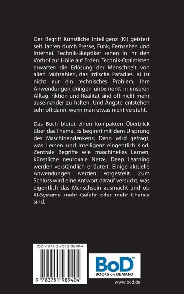 Der Begriff Künstliche Intelligenz (KI) geistert seit Jahren durch Presse, Funk, Fernsehen und Internet. Technik-Skeptiker sehen in ihr die Vorhölle auf Erden. Technik-Freaks erwarten die Erlösung der Menschheit von allen Mühsahlen, das irdische Paradies. KI ist nicht nur ein technisches Problem. Ihre Anwendungen dringen unbemerkt in unseren Alltag. Fiktion und Realität sind oft nicht mehr auseinander zu halten. Ängste entstehen besonders dann, wenn man etwas nicht versteht. Das Buch bietet einen kompakten Überblick über das Thema. Es beginnt mit dem Ursprung des Maschinendenkens. Dann wird gefragt, was Lernen und Intelligenz eingentlich sind. Zentrale Begriffe wie maschinelles Lernen, künstliche neuronale Netze, Deep Learning werden verständlich erläutert. Anwendungen werden vorgestellt. Zum Schluss wird eine Antwort darauf versucht, was eigentlich das Menschsein ausmacht und ob KI-Systeme mehr Gefahr oder mehr Chance sind.