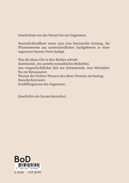 Geschichten von der Vorzeit bis zur Gegenwart.Buntschriftstellerei nennt man eine literarische Gattung, die Wissenswertes aus unterschiedlichen Sachgebieten in einer sogenannten bunten Form darlegt.Was die Muse Clio in ihre Bücher schrieb.Kontinuität, ein zutiefst menschliches Bedürfnis.Aus vorgeschichtlicher Zeit zur Zeitenwende, vom Mittelalter bis zur Renaissance.Warum der Dichter Petrarca den Mont Ventoux nie bestieg.Barocke Kontraste.Erzählfragmente.Geschichte als Ganzes betrachtet.