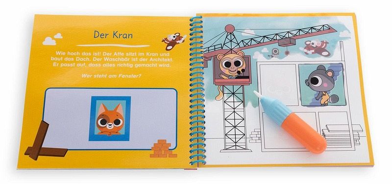 Mit Wasser malen, ganz ohne Flecken! Vorsicht, Baustelle! Hier geht's zum Wassermalspaß: In diesem Malbuch mit Wassertankpinsel laden lustige Baustellen-Szenen Kinder ab 3 Jahren dazu ein, die Bilder zum Leuchten zu bringen. Einfach den Zauberpinsel mit Wasser befüllen und dann über das Bild streichen - schon erscheinen Bagger, Kran und Co. in bunten Farben. Ob zu Hause, im Auto oder im Wartezimmer: Der Wassermalspaß ist perfekt für unterwegs. Das Malen mit Wasser gibt keine Flecken und der Pinsel wird in einer kleinen Tasche am Buch aufbewahrt. Nebenbei sorgt das Malen für Entspannung und fördert die Feinmotorik, Konzentration und das logische Denken. Garantierter Wassermalspaß für kleine Hände! * Einfach Pinsel mit Wasser befüllen und losmalen * Immer-wieder-malen * Kleine Suchspiele und viel zu entdecken * Ideal für unterwegs: Kleine Pinseltasche