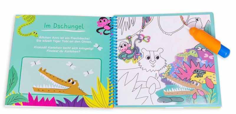 Werden die Bilder mit dem Pinsel angefeuchtet, erstrahlen sie in bunten Farben und weitere versteckte Motive kommen zum Vorschein. Trocknen die Bilder, verschwinden die Farben auch wieder. Die Bilder können von Neuem angemalt werden - immer und immer wieder.