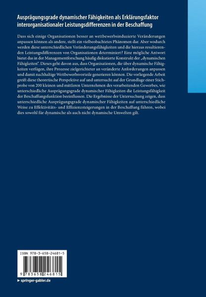 Dass sich einige Organisationen besser an wettbewerbsinduzierte Veränderungen anpassen können als andere, stellt ein vielbeobachtetes Phänomen dar. Aber wodurch werden diese unterschiedlichen Veränderungsfähigkeiten und die hieraus resultierenden Leistungsdifferenzen von Organisationen determiniert? Eine mögliche Antwort bietet das in der Managementforschung häufig diskutierte Konstrukt der "dynamischen Fähigkeiten". Dieses geht davon aus, dass Organisationen, die über dynamische Fähigkeiten verfügen, ihre Prozesse zielgerichteter an veränderte Anforderungen anpassen und damit nachhaltige Wettbewerbsvorteile generieren können. Die vorliegende Arbeit greift diese theoretische Perspektive auf und untersucht auf der Grundlage einer Stichprobe von 200 kleinen und mittleren Unternehmen des verarbeitenden Gewerbes, wie unterschiedliche Ausprägungsgrade dynamischer Fähigkeiten die Leistungsfähigkeit der Beschaffungsfunktion beeinflussen. Die Ergebnisse der Untersuchung zeigen, dass unterschiedliche Ausprägungsgrade dynamischer Fähigkeiten auf unterschiedliche Weise zu Effektivitäts- und Effizienzsteigerungen in der Beschaffung führen, wobei dies sowohl für dynamische als auch nicht dynamische Umwelten gilt.