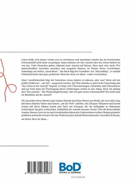 Leben heißt, sich immer wieder neu zu orientieren und manchmal scheint das im bestehenden Lebensmodell nicht mehr zu gelingen. Dann nehmen wir eine Auszeit oder das Leben fordert sie von uns. Viele Menschen gehen während einer Auszeit auf Reisen. Muss man aber nicht. Wie unterschiedlich Auszeiten aussehen und ausgehen können, ist Thema dieser Geschichten-Sammlung von sieben "Auszeitlern". Das Buch folgt der Grundidee des "Storytelling", es enthält Erlebnisberichte und ganz praktische Hinweise doch vor allem - wahre Geschichten. Einer Unzufriedenheit folgt der Entschluss etwas ändern zu müssen, aber was? Meist soll der größte Zeitfresser - "der Job" - ausgesetzt werden. Ein Plan entsteht, er geht in die Umsetzung und "das Leben in der Auszeit" beginnt. Es birgt viele Überraschungen, Einsichten und Erkenntnisse und am Ende dann die Übertragung dieser Erfahrungen zurück in den Alltag. Doch wie gelingt das? Was entsteht - "die Wiedereingliederung" oder ein ganz neues Lebensmodell? Was sieht man im Rückblick auf die Auszeit?Die Auszeitler dieses Buches sind Andrea Künstle und Klaus Breuer aus Berlin, die zwei Jahre lang mit ihren Hunden Momo und Sammy "um die Welt" radelten. Das Ehepaar Mohamed und Katrin Gomaa mit ihren Söhnen Karim und Faris aus Erlangen, die ein Sabbatjahr in Mohameds Geburtsland Ägypten verbrachten. Schließlich die Autorin Susanne Nestor. Über die Reiseschleife London, Buenos Aires ist sie nach wiederholten Jahren des Umherziehens in ihrer Heimat gelandet, geblieben und nicht verreist. Für eine kurze Weile kreuzten sich die Reiserouten aller Auszeitler in Basata, am Roten Meer im Sinai....