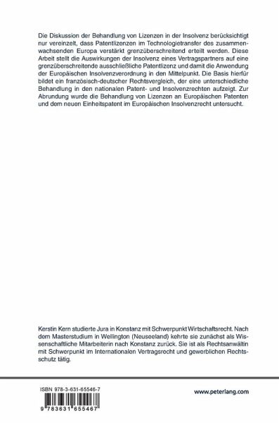 Inhalt: Grundlagen des französischen und deutschen Patentlizenz- und Insolvenzrechts - Ausschließliche Patentlizenzen im französischen und deutschen Insolvenzrecht im Rechtsvergleich - Anwendung der Europäischen Insolvenzverordnung auf grenzüberschreitende Lizenzen am nationalen Patent, Europäischen Patent sowie Einheitspatent.