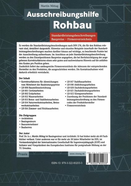 Im Buch werden die Standardleistungsbeschreibungen nach DIN 276, die für den Rohbau relevant sind, detailliert dargestellt. Hinweise und einzelne Beispiele innerhalb der Standardleistungsbeschreibungen machen darüber hinaus den Anwender auf wichtige zu beachtende Punkte bei der Ausschreibung aufmerksam. Im Anschluss an jede Standardleistungsbeschreibung werden zu den Einzelpositionen Baupreise angegeben, die bei Berücksichtigung der angegebenen Korrekturfaktoren einen sehr guten und nachweisbaren Hinweis auf die anfallenden Kosten pro Position geben. Zusätzlich liefert das umfangreiche Firmenverzeichnis die entsprechenden Hersteller zu den Produkten, die ausgeschrieben werden. Die Kontaktaufnahme wird dadurch erheblich vereinfacht.