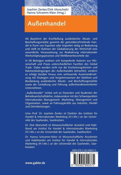 Erstes Kapitel: Einführung.- I. Außenhandel und internationales Marketing.- II. Die Bedeutung des Außenhandels für die deutsche Wirtschaft.- Zweites Kapitel: Erscheinungsformen, Rahmenbedingungen, Einflussfaktoren.- A. Erscheinungsformen, historische und künftige Entwicklung des Außenhandels.- I. Exporte als Basisform des Außenhandels: Erschließung ausländischer Absatzmärkte.- II. Importe als Basisform des Außenhandels: Erschließung ausländischer Beschaffungsmärkte und Produktionsstandorte.- III. Kompensationshandel als Sonderform des Außenhandels: Erscheinungsformen und Perspektiven des internationalen Tauschhandels.- IV. Außenhandelsunternehmen: Erscheinungsformen und Einschaltung.- B. Politische und unternehmensstrategische Einflussfaktoren.- I. Liberalisierung im Spannungsfeld von WTO und regionalen Integrationsabkommen.- II. Stand und kritische Analyse der globalen Liberalisierung: WTO, GATT, GATS, TRIPs und ihre Auswirkungen auf den Außenhandel.- III. Nicht-tarifäre Handelshemmnisse: Analyse der Auswirkungen auf den Außenhandel.- IV. Stand und kritische Analyse der regionalen Integrationsabkommen: EU.- V. Stand und kritische Analyse der regionalen Integrationsabkommen: NAFTA, MERCOSUR.- VI. Stand und kritische Analyse der regionalen Integrationsabkommen: ASEAN.- Drittes Kapitel: Selektions-, Eintritts- und Bearbeitungsstrategien ausländischer Absatzmärkte.- A. Selektion von Auslandsmärkten.- I. Internationale Marktauswahl: Konzepte und Methoden.- II. Internationale Wettbewerbsanalyse: Bedeutung für exportorientierte Unternehmen.- III. Internationale Kundensegmentierung.- B. Export als Markteintrittsstrategie.- I. Export, kooperative und integrative Markteintrittsformen: Eine vergleichende Analyse.- II. Direkter vs. indirekter Export: Eine vergleichende Analyse.- III. Exportstrategien von Born Global Firms.- C. Bearbeitung internationaler Absatzmärkte.- I. Produkt- und Programmpolitik im Export: Die Perspektive der Industriegüterhersteller.- II. Country-of-Origin-Effekte: Bedeutung und Implikationen für das Internationale Marketing.- III. Servicepolitik im Export: Die Perspektive der Industriegüterhersteller.- IV. Servicepolitik im Export: Die Perspektive der Dienstleistungsanbieter.- V. Preispolitik im Export: Die Perspektive der Pkw-Industrie.- VI. Internationales Pricing im B2B-Geschäft.- VII. Integrierte Kommunikation für Marken im Export.- VIII. Key-Account-Management im Export: Die Perspektive der Konsumgüterhersteller.- IX. Key-Account-Management im Export: Die Perspektive der Industriegüterhersteller.- X. Das Internet als Kommunikations- und Distributionskanal im Export: Perspektiven für den B2B- und B2C-Bereich.- D. Ausgewählte Fallbeispiele.- I. Bewertung des Risikos von Auslandsmärkten: Das BERI-Konzept.- II. Exportmarketing: Das Fallbeispiel Hager.- III. Markenpolitik auf Exportmärkten: Das Fallbeispiel Alpina.- IV. Internationale Werbeplanung in der Automobilbranche.- Viertes Kapitel: Selektions-, Eintritts- und Bearbeitungsstrategien ausländischer Beschaffungsmärkte.- A. Erscheinungsformen und Konzepte.- I. Analyse und Auswahl ausländischer Beschaffungsmärkte: Konzepte und Methoden.- II. Marktorientierte Formen des Auslands-Sourcing: Eine vergleichende Analyse.- III. Importe auf Basis kooperativer und integrativer Sourcing-Optionen: Eine vergleichende Analyse.- IV. E-Procurement und internationale Beschaffung.- V. Internationales Supplier-Relationship-Management: Perspektiven in der internationalen Beschaffung.- B. Spezialaspekte des Einzelhandels.- I. Außenhandel des Einzelhandels: Bedeutung und Besonderheiten.- II. Kooperative Strategien der Auslandsbeschaffung: Das Beispiel der GARANT SCHUH + MODE AG.- Fünftes Kapitel: Management des Außenhandels.- A. Gestaltung der Außenhandelstransaktionen.- I. Standardisierungsansätze zur Reduktion der Transaktionskosten im Außenhandel: Ein Überblick.- II. Internationales Kaufvertragsrecht.- III. Risikomanagement im Außenhandel: Ein Überblick.- IV. Instrumente zur Absicherung gegen Fremdwährungsrisiken.- B. Führung außenhandelsorientierter Unternehmen.- I. Organisation außenhandelsorientierter Unternehmen: Strukturelle und prozessuale Formen.- II. Controlling: Besonderheiten im Außenhandel.- III. Herausforderungen an ein globales Supply-Chain-Management.- IV. Informationsmanagement außenhandelsorientierter Unternehmen: IT-Systeme als Voraussetzung.- C. Ausgewählte Fallbeispiele.- I. Standardisierungsansätze im internationalen Zahlungsverkehr: Ein Überblick.- II. Ausfuhrkreditversicherungen als Instrument des Risikomanagements: Das Fallbeispiel Euler Hermes.- III. Supply-Chain-Management im Export: Das Beispiel BLG Automotive.- Stichwortverzeichnis.