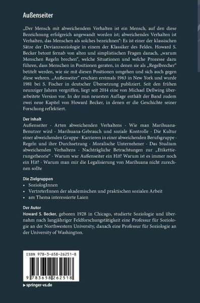 "Der Mensch mit abweichendem Verhalten ist ein Mensch, auf den diese Bezeichnung erfolgreich angewandt worden ist; abweichendes Verhalten ist Verhalten, das Menschen als solches bezeichnen": Es ist einer der klassischen Sätze der Devianzsoziologie in einem der Klassiker des Feldes. Howard S. Becker betont fernab von alten und simplistischen Fragen danach, "warum Menschen Regeln brechen", welche Situationen und welche Prozesse dazu führen, dass Menschen in Positionen geraten, in denen sie als "Regelbrecher" betitelt werden, wie sie mit diesen Positionen umgehen und sich auch gegen diese wehren. "Außenseiter" erschien erstmals 1963 in New York und wurde 1981 bei S. Fischer in deutscher Übersetzung publiziert. Seit den frühen neunziger Jahren vergriffen, liegt seit 2014 eine von Michael Dellwing überarbeitete Version vor. In der nun neuesten Auflage enthält der Band zudem zwei neue Kapitel von Howard Becker, in denen er die Geschichte seiner Forschung reflektiert.