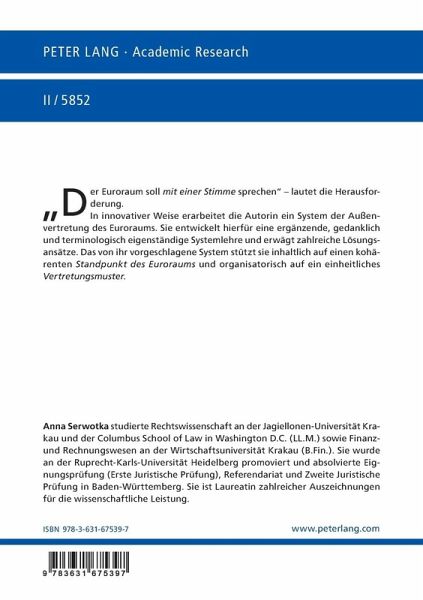 "Der Euroraum soll mit einer Stimme sprechen" - lautet die Herausforderung. In innovativer Weise erarbeitet die Autorin ein System der Außenvertretung des Euroraums. Sie entwickelt hierfür eine ergänzende, gedanklich und terminologisch eigenständige Systemlehre und erwägt zahlreiche Lösungsansätze. Das von ihr vorgeschlagene System stützt sie inhaltlich auf einen kohärenten Standpunkt des Euroraums und organisatorisch auf ein einheitliches Vertretungsmuster.