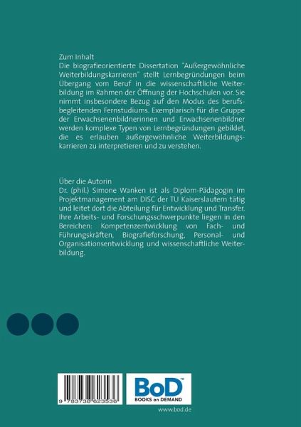 Die biografieorientierte Dissertation "Außergewöhnliche Weiterbildungskarrieren" stellt Lernbegründungen beim Übergang vom Beruf in die wissenschaftliche Weiterbildung im Rahmen der Öffnung der Hochschulen vor. Sie nimmt insbesondere Bezug auf den Modus des berufsbegleitenden Fernstudiums. Exemplarisch für die Gruppe der Erwachsenenbildner und Erwachsenenbildnerinnen werden komplexe Typen von Lernbegründungen gebildet, die es erlauben außergewöhnliche Weiterbildungskarrieren zu verstehen.