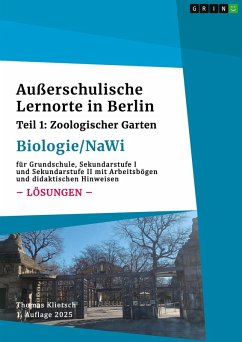 Fachbuch aus dem Jahr 2025 im Fachbereich Didaktik - Biologie, , Sprache: Deutsch, Abstract: Das Lösungsbuch zu dem 1. Teil der Buchreihe "Außerschulische Lernorte in Berlin (Biologie/Nawi)" mit detaillierten Lösungsvorschlägen zu allen Aufgaben. Es vereinfacht die Vorbereitung und spart viel Zeit für die Vorbereitung einer Exkursion in den Zoologischen Garten Berlin. Das Buch richtet sich speziell an Lehrer aller Schulstufen. Der 1. Teil der Buchreihe "Außerschulische Lernorte in Berlin (Biologie/Nawi)" beinhaltet Unterrichtseinheiten und vorgefertigte Arbeitsblätter für Lehrer aus der Grundschule, Sek I und Sek II für die Arbeit im Zoologischen Garten. Es wird ein kurzer theoretischer Einstieg zum Thema gegeben und dann differenziert nach Schulstufen die Unterrichtseinheit mit dazugehörigen Arbeitsblättern angeboten. Der Autor ist Studiendirektor für Naturwissenschaft im Ruhestand. Er unterrichtete Biologie und Mathematik an der Berliner Schule und hat in diesem Zusammenhang viele Exkursionen mit Schülern an Außerschulischen Lernorten geplant und durchgeführt. Von 1998 bis 2006 unterrichtete er an der Deutschen Schule in Guatemala, in den Jahren von 2016 bis 2024 in Mexiko (Puebla).