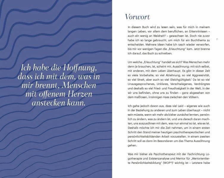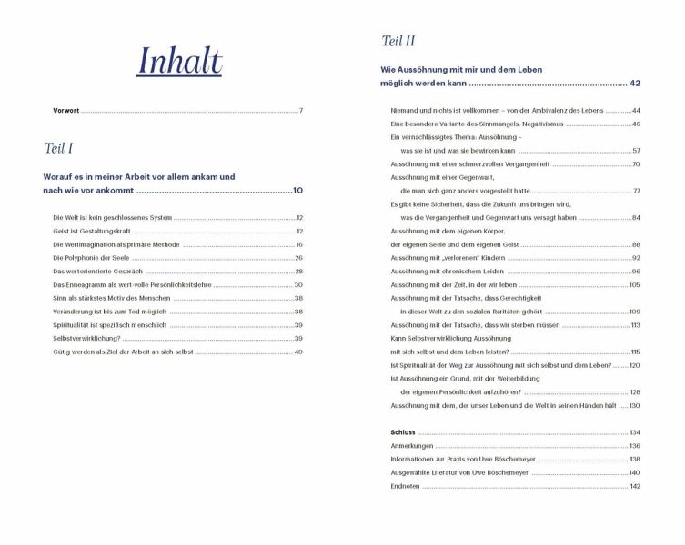 In verunsichernden Zeiten gibt die Weisheit des erfahrenen Therapeuten Uwe Böschemeyer uns Halt und Hilfe. Wie wir mit allem Unvollkommenen in unserem Leben gut leben können, ohne zu resignieren. Wie es uns gelingt, auf ein vergangenes, schwieriges Leben ohne Bitterkeit, Hass, Verzweiflung zurückzublicken und mit offenem Herzen das Leben anzunehmen, wie es ist. Für all das zeigt uns Uwe Böschemeyer mit seiner warmen, entlastenden Art einen Weg auf. Dieses Buch ist für alle, die bereit sind, sich das, was sie im Innersten wissen oder ahnen, anzusehen. Die auch in schwierigen Zeiten bereit sind zu ändern, was geändert werden kann, und sich auszusöhnen mit dem, was nun einmal so ist, wie es ist. Menschsein heißt, sich verändern zu können. Aussöhnung mit dem Leben heißt, zu leben.